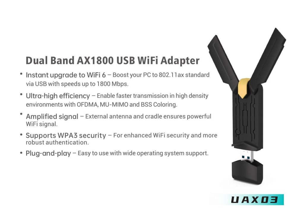 – Boost your PC to 802.11ax standard via USB with speeds up to 1800 Mbps.